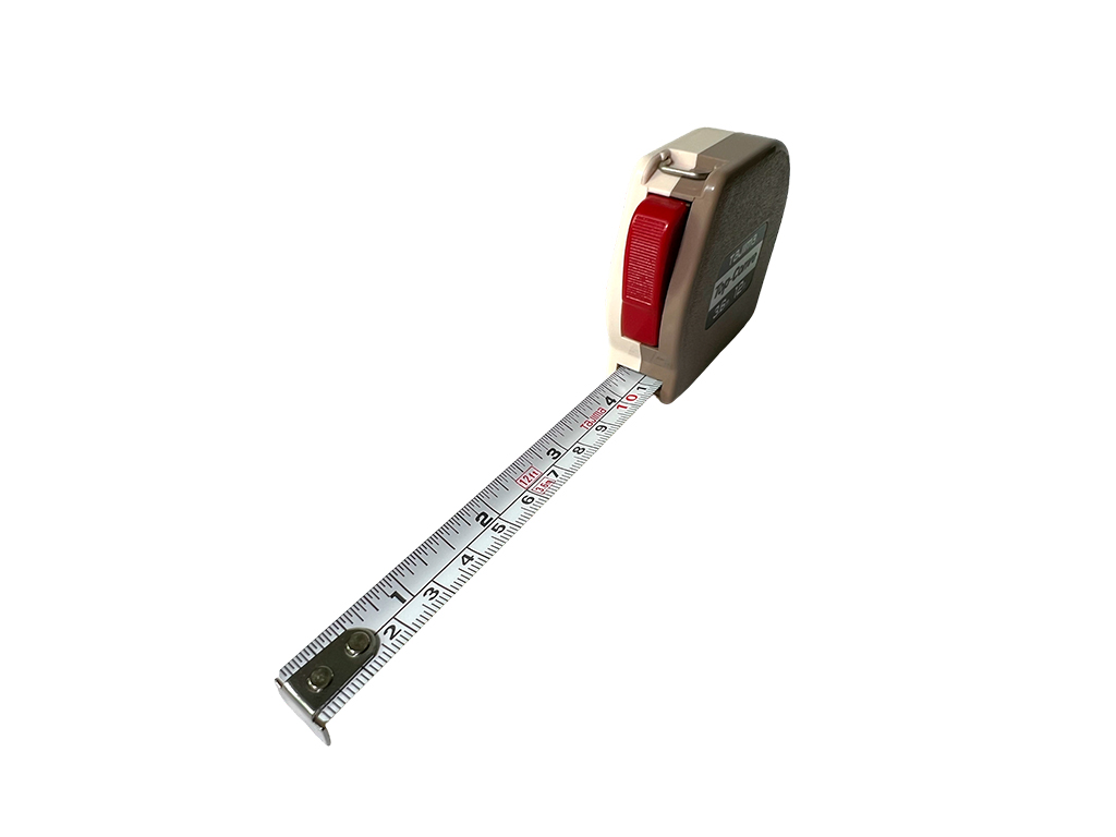 Пластмассовый корпус, кнопка перемотки ленты в исходное положение, подвижный крючок в начале шкалы, карабин для крепления к поясу.